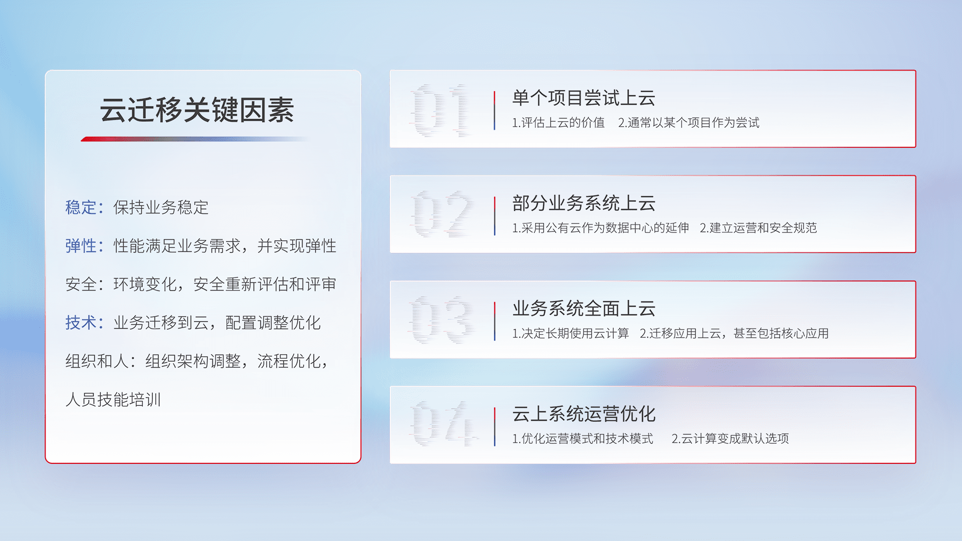 结合实际业务,,,从规划设计、、、、云平台选型、、、云原生改造、、、数据迁移、、、集成交付,,迁移全过程为客户识别最佳上云路径,,,做好风险识别管理,,设计网络架构、、身份权限、、安全审计合规、、、、操作审计、、日志审计、、、监控告警策略、、多站点容灾设计等,,,对云上基础设施进行整体规划,,,提升IT治理水平,,,,以满足弹性、、、、高可用、、高性能的需求。。。